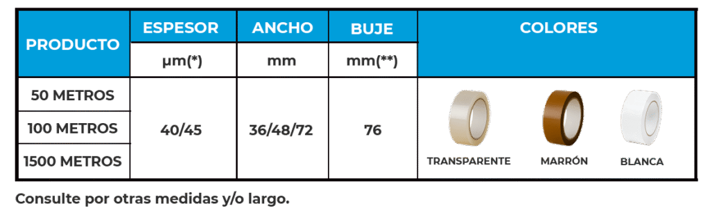 Nuestra cinta está desarrollada a partir de una película de polipropileno biorientado (BOPP) de 23 micrones, combinada con un adhesivo acrílico base agua de 17 micrones, logrando un espesor total de 40 micrones.